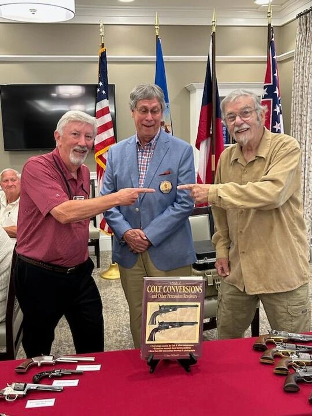 August 2023 Guest Speaker Larry Floyd (far right) is welcomed by Commander Jeff Toalson (L) and Ron Perry 1st Lt. Commander (center). His talk totally focused on the conversion of pistols, post-war, from percussion to cartridge.