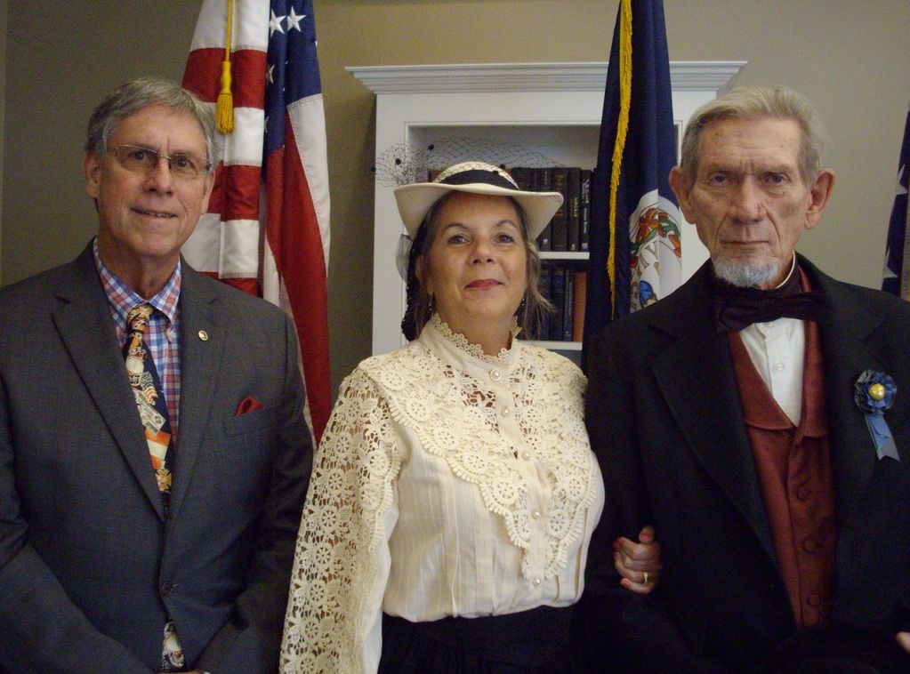 1st Lt. Commander Ron Perry (L) welcomes President Jefferson Davis, and his wife Varina, to the July meeting of the James City Cavalry. Mrs. Cookie Batten and Mr. Sam Winkler provided a marvelous first-person presentation of the life of Jefferson Davis and their lives together during the most turbulent time in our nation's history.