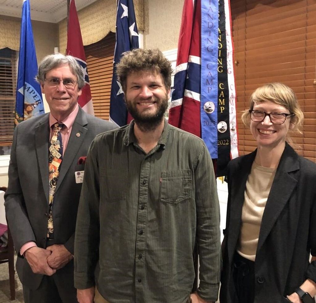1st Lt. Commander Ron Perry (L) welcomes our February speaker, Dr. Eric Schweickart of the Colonial Williamsburg Archaeological Department. Eric was joined by Crystal Castleberry who is a Public Archaeologist with C.W. Eric gave an enthralling talk on the discovery and identification of the 4 C.S.A. soldiers all of whom probably died in the Union hospital in the Baptist Church next door to the M