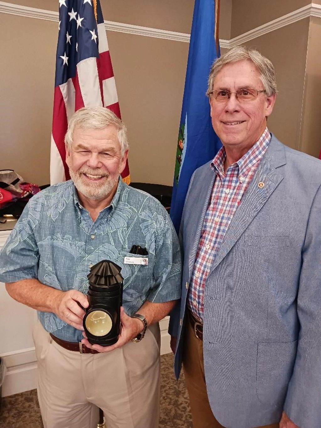 Captain Bob Kennedy, USN-Retired, spoke to the James City Cavalry on August 28 about the submarine H. L. Hunley. His talk covered her development, rail transfer to Charleston, sea-trials, attack and sinking of the USS Housatonic, her loss, recovery and restoration. Captain Kennedy is holding a replica signal lantern of the one used by the Hunley to signal 'mission complete headed home.' Bob is